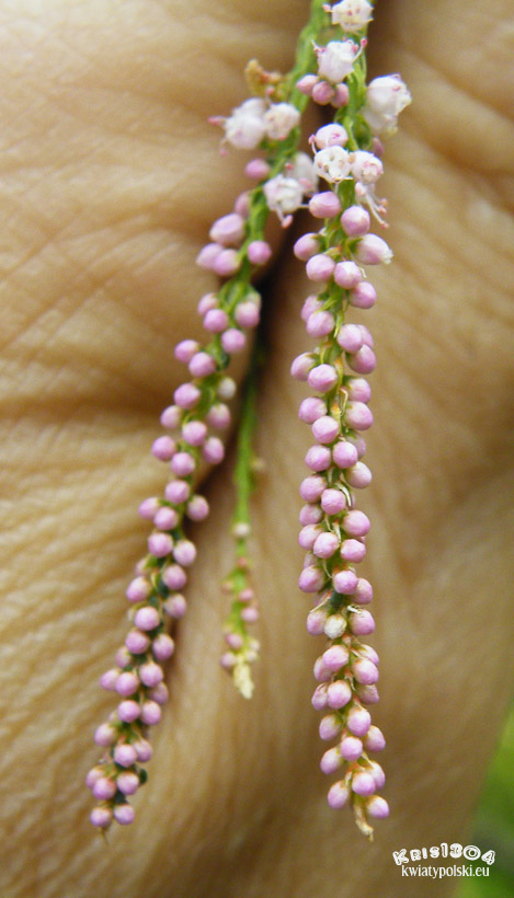 Jasnoróżowe, 5-krotne, zebrane w luźne grona. Mają długość do 3 cm, a ich przysadki są szydlaste i dłuższe od szypułek. Pręcików 5.