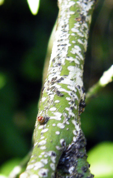 Zielone gałązki bez przetchlinek, bardzo cienkie, gęsto pokryte brunatnymi brodawkami, obłe. Rozgałęzia się pod prostym kątem. Pączki szczytowe największe, pączki przyliściowe znacznie mniejsze, wszystkie mają okrywy zielone z brązowym obrzeżeniem, zwłaszcza w górnej części.