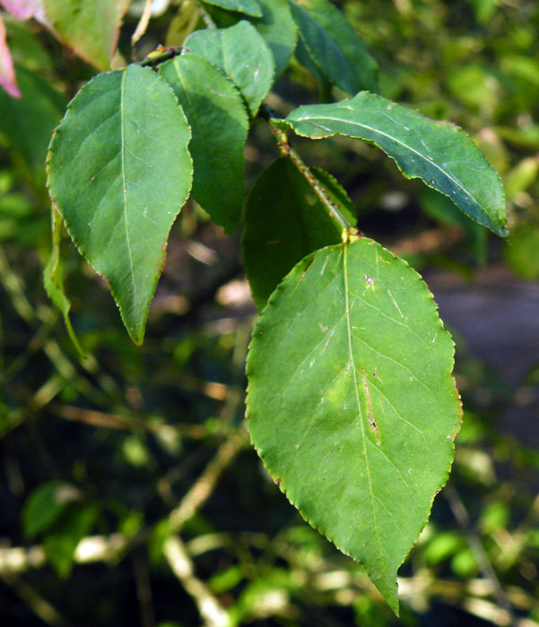 Jasnozielone, naprzeciwległe, eliptyczne, obustronnie zaostrzone, o delikatnie i nierówno piłkowanych brzegach. Nerwów bocznych wyraźnie widocznych mają nie więcej, niż 3-4. Blaszki o długości do 6 cm i szerokości do 3,5 cm o nerwacji pierzastej. Ogonek liściowy krótki do 3 mm. Liście usychające w sposób naturalny stają się jasnożółte.