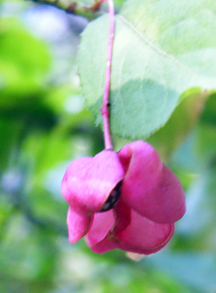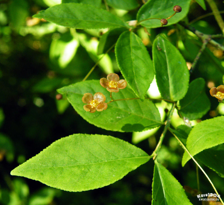 Czterograniasta, zielonawożółta później czerwieniejąca torebka, zawierająca 3 kulistawe, połyskujące, brązowo-czarne nasiona wystające z krwistoczerwonej osnówki i po dojrzeniu zwisające na sznureczkach poniżej torebki.