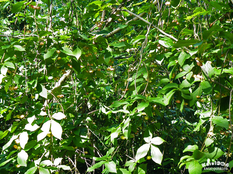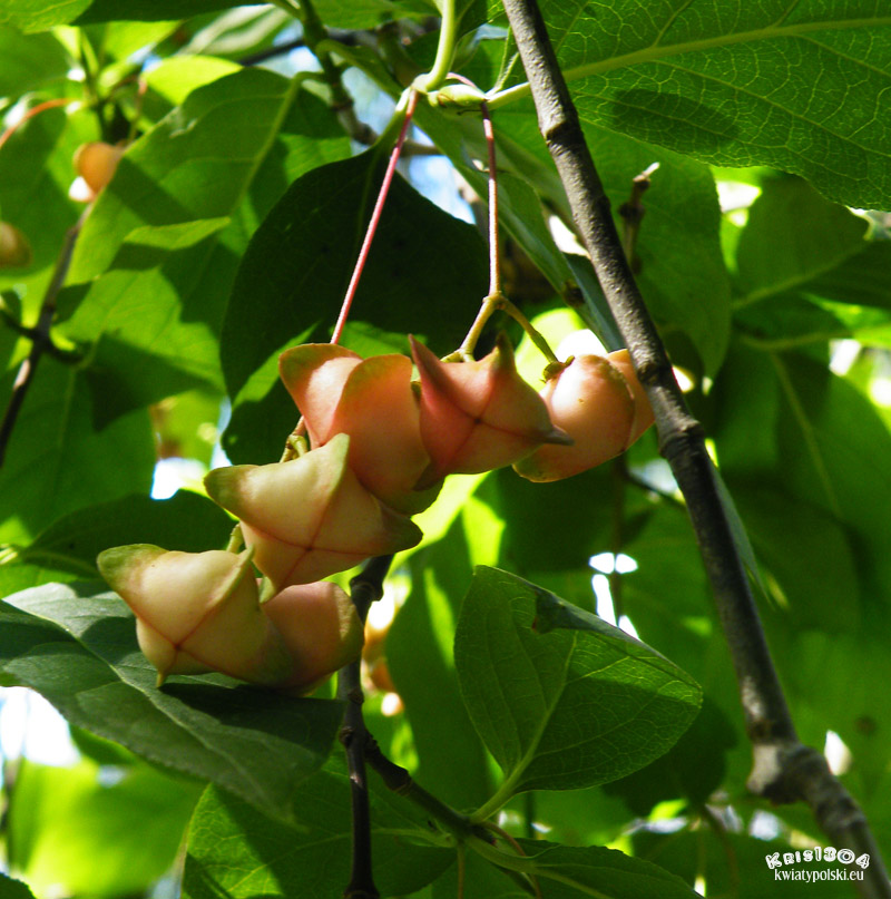 Czterograniasta, lub pięciograniasta zielonawożółta później czerwieniejąca torebka, zawierająca pomarańczowe nasiona