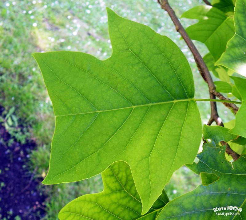 Mają długość 10-15 cm i szerokość 12-20 cm, są wykształcone w sposób wykluczający pomyłkę, w zarysie czworokątne i podzielone na cztery nierównej wielkości klapy, których wzdłużne brzegi przebiegają prawie równolegle do siebie. Liść jest z przodu jakby ucięty albo lekko wycięty. Jego górna powierzchnia jest błyszcząca, żywo zielona, a dolna nieco jaśniejsza i z lekka pokryta woskiem. Jesienią liście przebarwiają się na złotożółto. Ogonki liściowe od 10 do 12 cm długości.