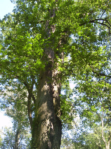 Drzewo o szerokiej, kopulastej lub pucharowato rozszerzonej ku górze koronie i o wysokości do 35-40m. Obwodowe, drobne gałęzie często zwisają. Pień o średnicy do 1,5 m jest prosty, u drzew wolno stojących często bywa nisko rozdzielony na kilka odnóg o dość sporych rozmiarach. Bardzo charakterystyczne dla tego gatunku są deskowato rozszerzone nasady głównych korzeni. Natomiast u drzew starszych nasada pnia jest przez to rozszerzona i wzmocniona poprzez potężne wsporniki.
