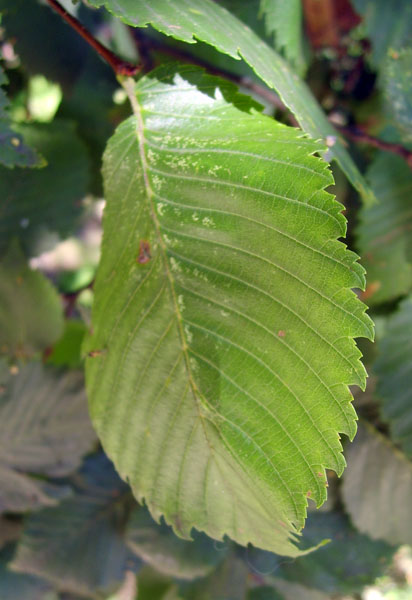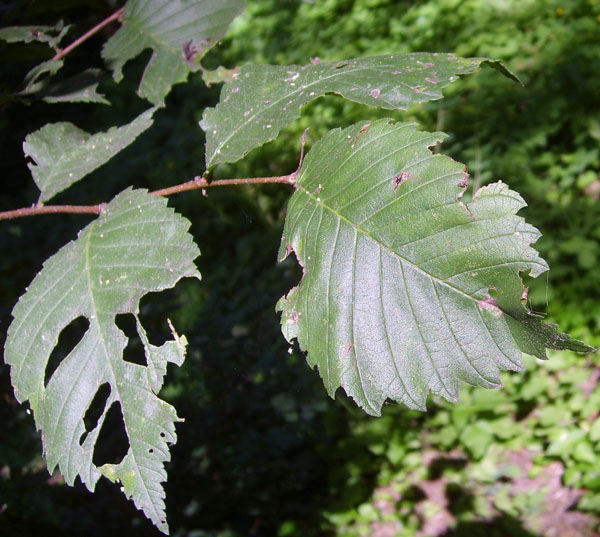 Liście o kształcie eliptycznym lub odwrotnie jajowatym, najszersze powyżej środka, długości 6-14 cm, podwójnie piłkowane, na szczycie nagle zaostrzone. Charakterystyczną cechą tego gatunku jest silna asymetryczność liści u nasady. Z wierzchu liście są gładkie lub nieco szorstkie, od spodu miękko omszone. Ogonek liściowy krótki.