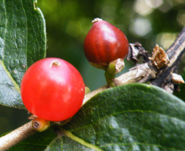 Czerwone jagody, czasem zrośnięte parami.