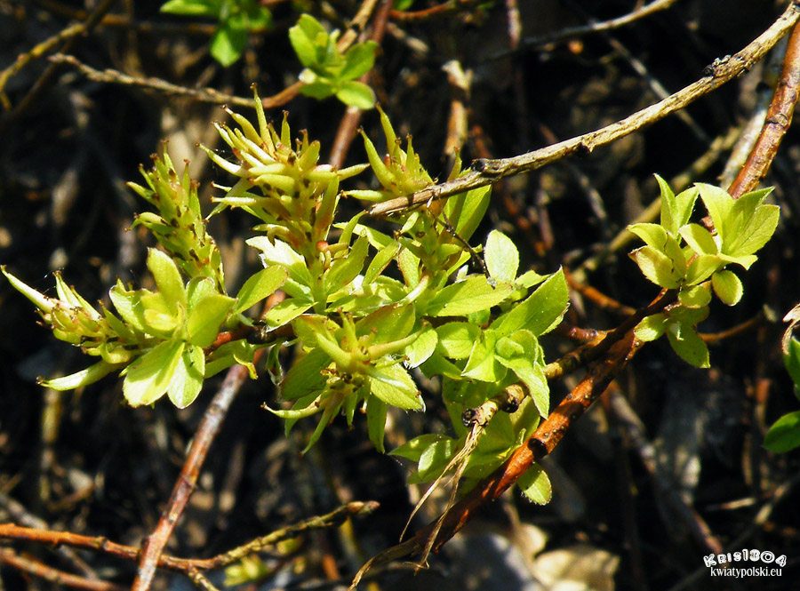 Roślina dwupienna. Kwiaty zebrane w kotki o ciemnopurpurowych łuskach, na szczycie ciemniejszych. Kotki mają długość ok. 2 cm i są owłosione. Wyrastają równocześnie z liśćmi. Kwiaty męskie mają po jednym miodniku, pręciki wolne. W kwiatach żeńskich słupki są początkowo owłosione, później łysieją.