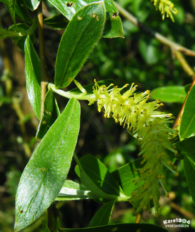 Wąskie, lancetowate o długości około 8 cm. Młode liście obustronnie jedwabiście owłosione, starsze tylko na spodniej stronie. Młode listki są żółte. Latem górna strona liści ciemnozielona, spodnia srebrzysta.