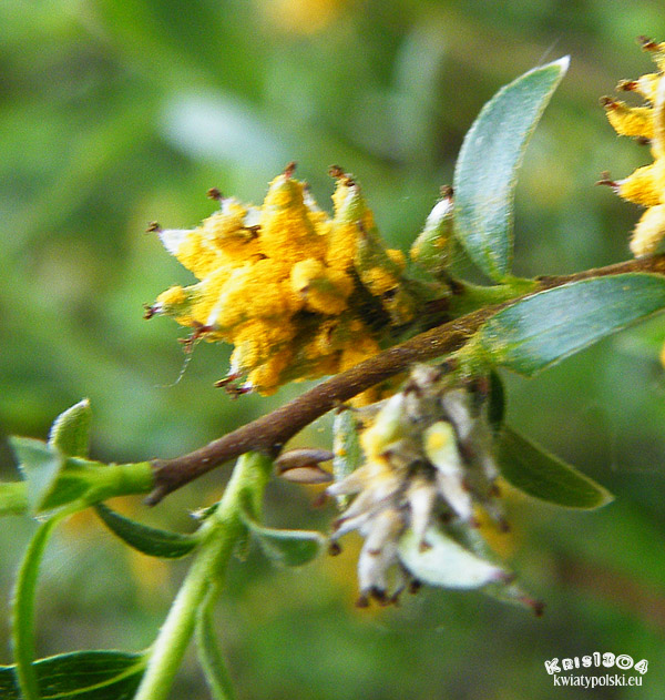 Roślina dwupienna. Kwiaty zebrane w kotki o dwubarwnych przysadkach - górą czarniawych, dołem jasnych. Kotki żeńskie wyrastają na szypułkach, mają jajowato-podługowaty kształt i długość 2 cm. Ich owłosione słupki o czerwonych znamionach osadzone są na słupku. Kotki męskie również mają dwubarwne przysadki. Ich kwiaty z jednym miodnikiem mają pręciki u nasady owłosione, o wolnych nitkach i pylnikach początkowo czerwonych, w czasie dojrzewania żółtych, a po przekwitnięciu brunatnych.