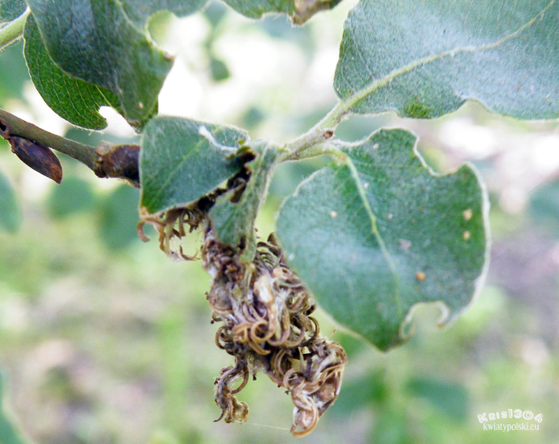Odwrotnie jajowate, najszersze w pobliżu wierzchołka, o wierzchołku ostro zakończonym i przeważnie przegiętym. Długość liści 3-7 cm, szerokość 1,5-3 cm. Z wierzchu liście ciemnozielone, na spodniej stronie szarozielone. Mają trwałe przylistki o uszkowatym kształcie (stąd nazwa gatunkowa rośliny) i wyraźnie widoczną nerwację, zwłaszcza na spodniej stronie. Młode liście silnie owłosione, później łysiejące, szczególnie na wierzchniej stronie. Nie czernieją podczas schnięcia.