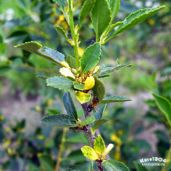 Krzew osiągający wysokość do 1,5 m. Wytwarza liczne pędy odroślowe, za pomocą których się rozkrzewia.