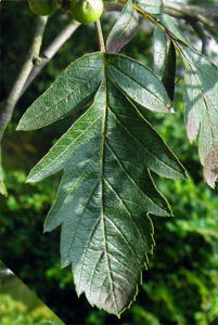 Jarząb mączny - liście podłużnoeliptyczne do jajowatych, nie podzielone, a tylko pierzastoklapowane, na ogonkach. Z wierzchu błyszcząco ciemnozielone, spodem gęsto owłosione białym kutnerem. Na brzegu nieregularnie podwójnie piłkowane. |