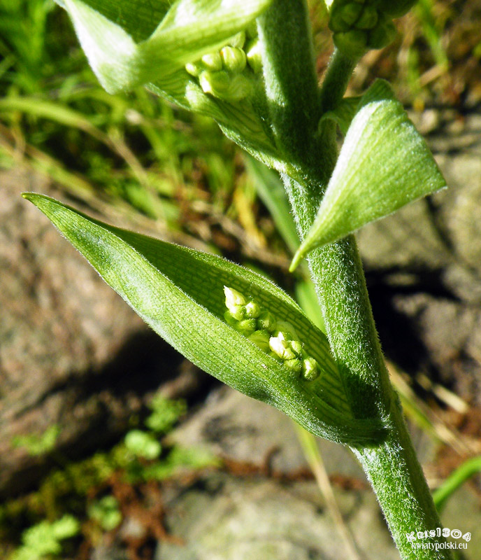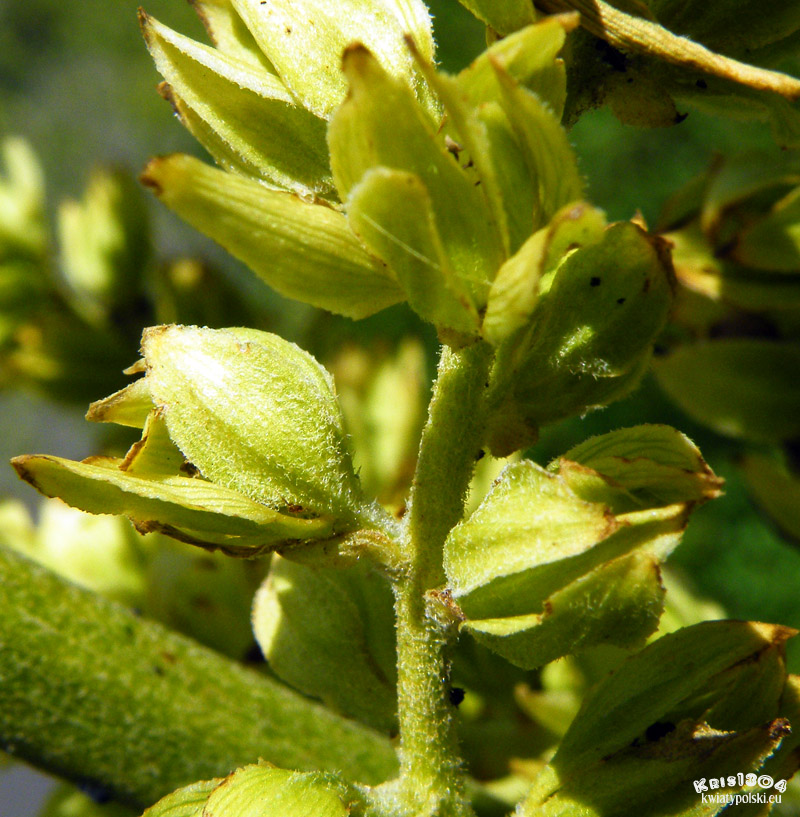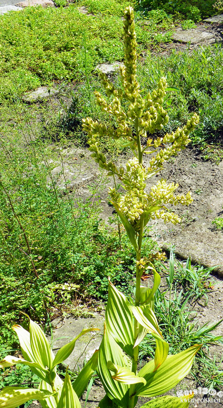 Kwiaty obupłciowe (trafiają się jednak kwiaty męskie), żółtozielone, zebrane na szczycie łodygi w wiechę. Okwiat składa się z 6 działek nie zróżnicowanych na koronę i kielich. Pręciki w liczbie 6, z dużymi żółtymi, nerkowatego kształtu pylnikami, słupek trójszyjkowy.