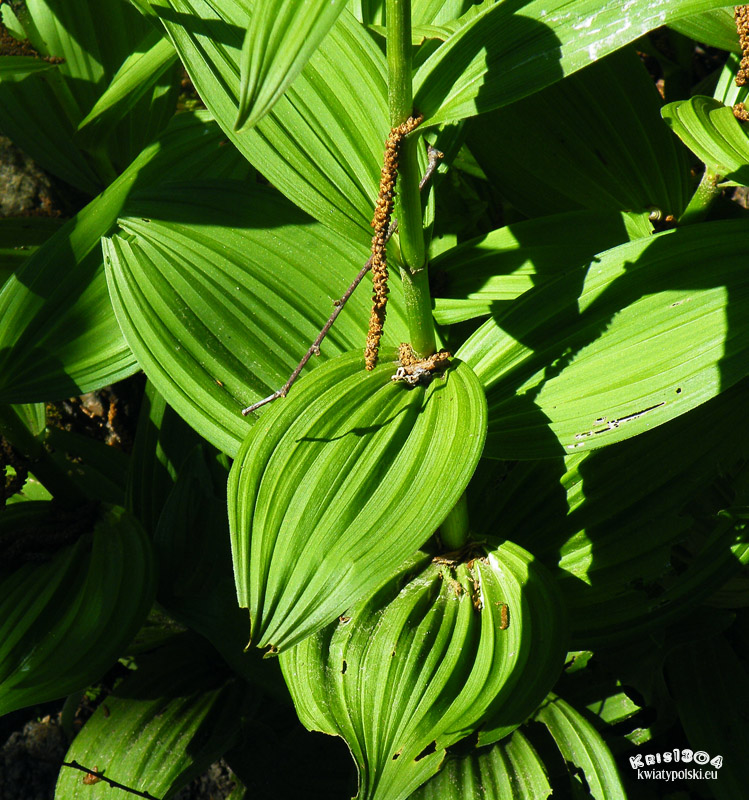 Liście skrętoległe. Duże, eliptyczne, podobne do liści goryczki kropkowanej, pofałdowane wzdłużnie, o wyraźnym podłużnym unerwieniu.