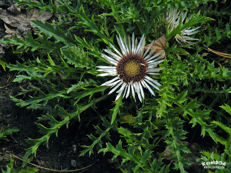 OPIS: Bylina tworząca płaskie, okazałe rozety złożone z lśniących, kolczastych, ostowatych liści. Pęd kwiatonośny pojedynczy lub rozgałęziony, z koszyczkiem na końcu. Koszyczki średnicy 10-15 cm, do 15 szt.. Kwitnie od lipca do września.