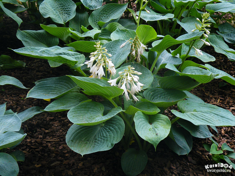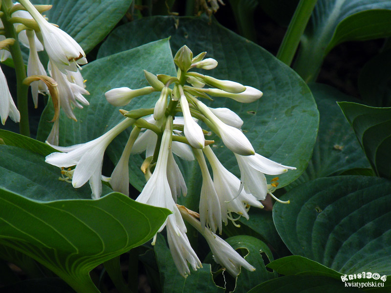 Kwiaty na szczycie pędu kwiatonośnego w długich kwiatostanach, bladoliliowe lub białe.
