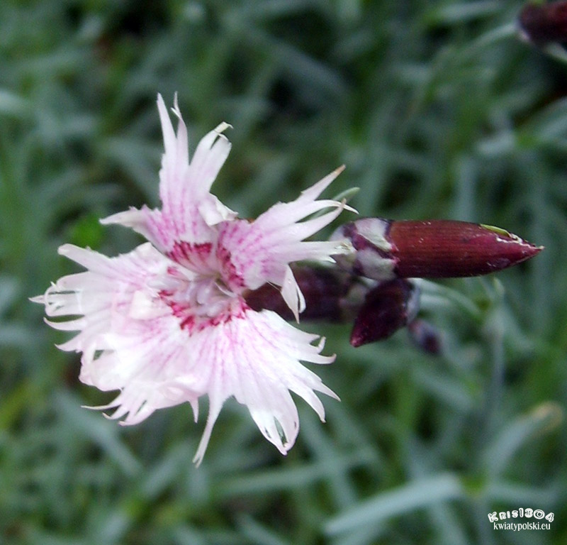 OPIS: Łodyga 30-70 cm wysokości, rozgałęziona, naga, gęsto ulistniona. Liście lancetowate, szorstkie na brzegach. Kwiaty pojedyncze lub dwa na końcu pędu, ciemno różowe. Kielich rurkowaty, purpurowy, ząbki lancetowate. Kwitnie od czerwca do sierpnia.