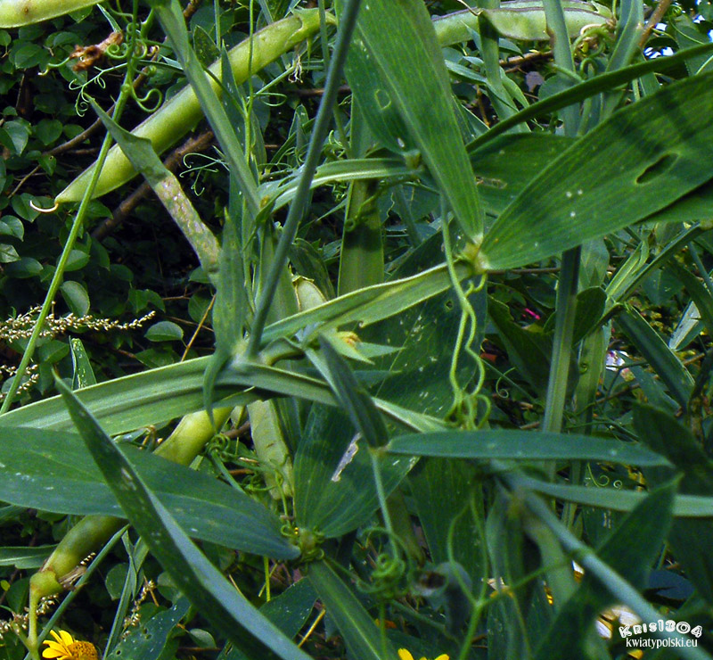 Liście złożone z jednej pary eliptycznych listków. Niektóre liście przekształcone w wąsy czepne za pomocą których roślina chwyta się podpór.