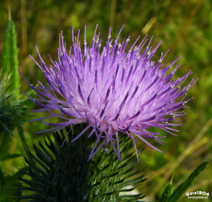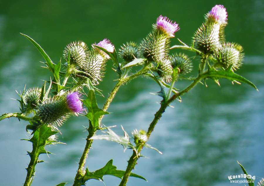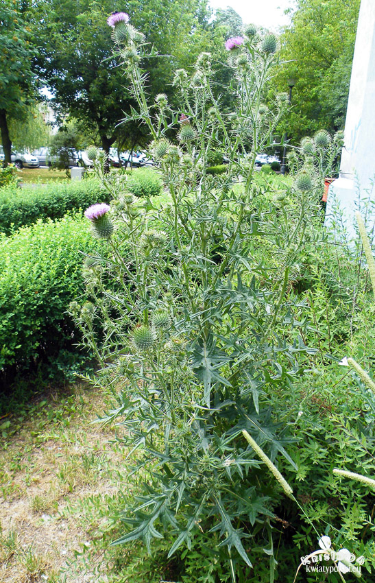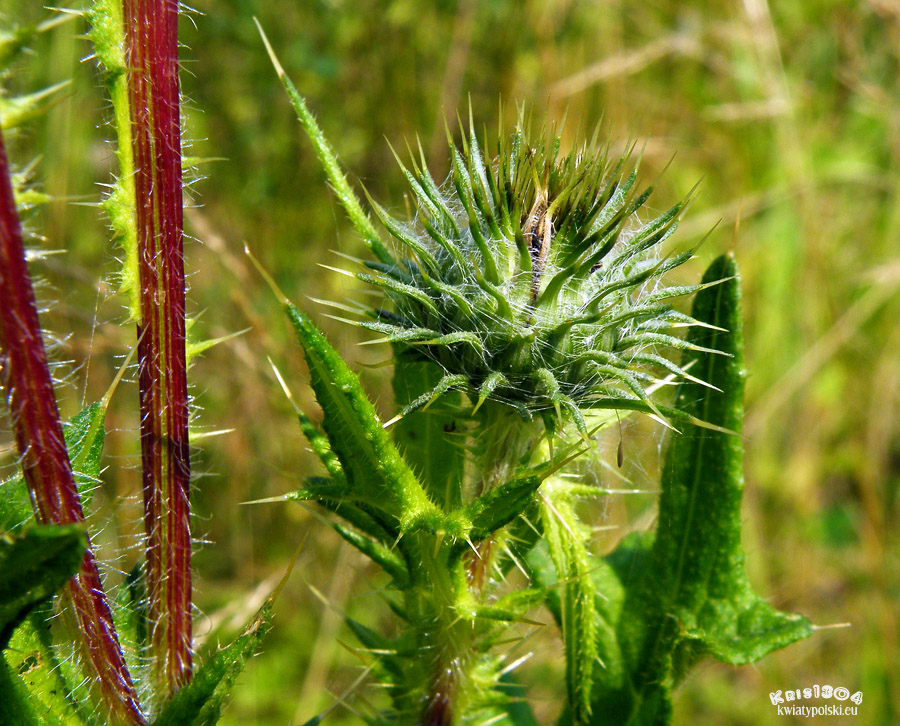 Kwiaty złożone. Roślina kolczasta. Koszyczki pojedyncze, dość duże, na kolczasto oskrzydlonych, ulistnionych szypułach, purpurowe