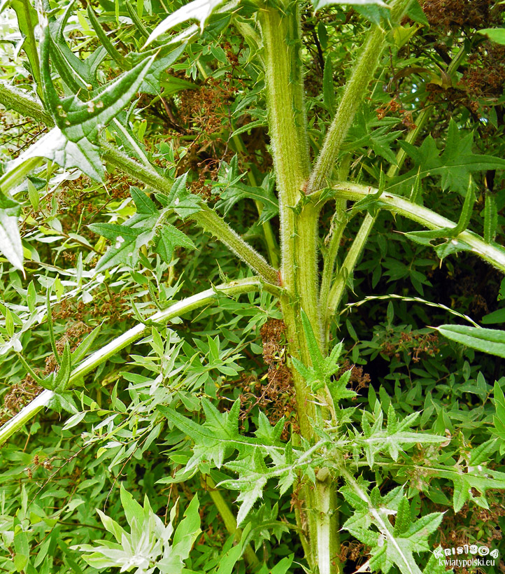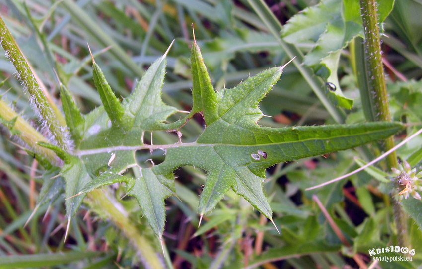 Liście szorstkie, pierzastosieczne, o odcinkach lancetowatych, częściowo rozciętych, na szczycie zakończone długim żółtawym kolcem,