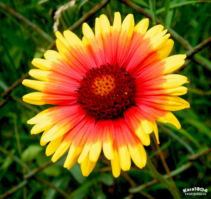 Kwiaty - kwiatostany typu koszyczek. Kwiaty języczkowate dwukolorowe, ciemno-pomarańczowe, na brzgu żółte. W środku koszyczka kwiaty rurkowate, prawie czarne.