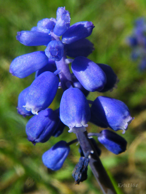 Kwiaty niebieskie, kuliste, o białych brzegach w gęstych gronach o długości ok. 8 cm. Bezwonne.