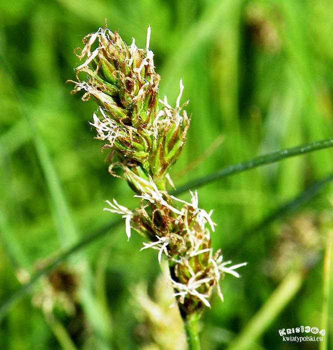 stojących jajowatych kłosów. Kłosy u dołu z kwiatami męskimi, z żeńskimi u góry. Plewy zaostrzone,