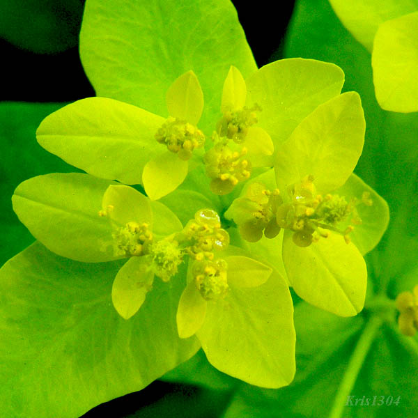 Kwiaty zebrane w 3-5 ramienną wierzchotkę. Są rozdzielnopłciowe, zebrane w cyjatium i silnie zredukowane. Kwiat męski ma